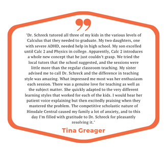 Mathematics tutoring, skill building, and test prep for middle school, high school and college students. Tutoring is available in-person or online. Subjects include pre-algebra, geometry, precalculus, single variable calculus, multivariable calculus, statistics, finite math, linear algebra, history of mathematics, improving math skills, organizational skills, enrichment, Mathlete prep, and Math Bowl prep.